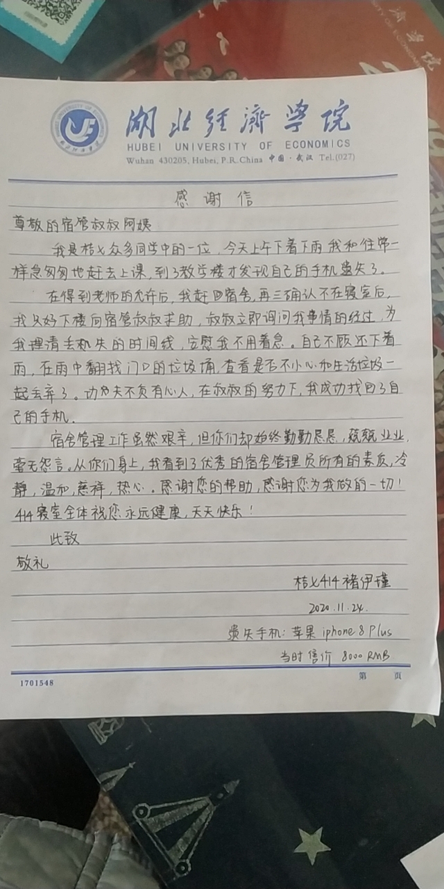 事后,该同学向孙师傅表示感谢,孙师傅摆摆手说道:“找到了就好,你赶紧回去上课吧,别耽误的学习。”下午14时,该同学手写了一封感谢信送至管理员值班室,再次感谢孙师傅帮她寻找手机,她写到:“宿舍管理工作虽然艰辛,但你们却始终勤勤恳恳、兢兢业业、毫无怨言。”