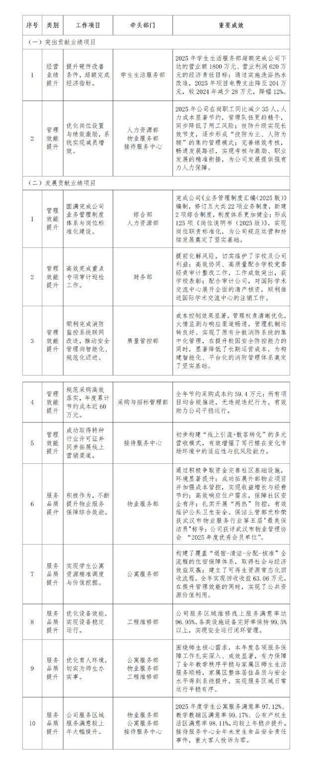 根据《湖北亿优物业管理有限责任公司部门年度目标责任管理办法》(鄂亿优物业发〔2024〕38号)有关规定,结合公司2025年目标责任考核结果,经公司党政联席会议研究决定,公司评定2025年发展贡献业绩项目12项,其中突出贡献项目2项、业绩贡献项目10项,现予公示: