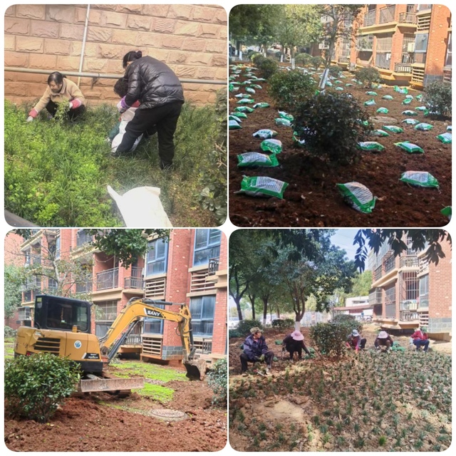 精益求精,把好施工质量关。 施工现场,施工人员三五人一组默契配合,有序推进绿化作业。一方面,对原有公共绿地内的杂草、枯枝、落叶进行全面清理,确保绿地清爽通透;另一方面,严格按照绿化种植技术规范,对增补区域进行翻土改良、施入有机底肥,并科学控制种植坑穴的尺寸与深度,确保新植苗木根系舒展、栽植牢固,切实提高苗木成活率与后期长势。