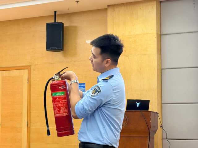 培训中,扈教官结合近年来高校典型火灾案例,重点讲解了校园常见消防隐患、日常消防检查注意事项、宿舍疏散逃生知识、灭火实操技能等相关知识点。随后,教官还现场演示了干粉灭火器“提、拔、握、压”操作步骤,讲解了消火栓、灭火毯等器材使用要领,帮助参训职工直观掌握规范操作方法。